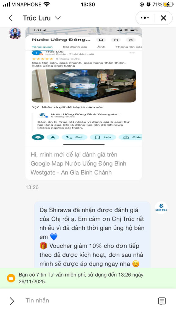 Sau khi sử dụng, đừng quên đánh giá nước Shirawa trên Google Maps Westgate để nhận voucher giảm 10% cho lần đặt nước tiếp theo nhé!