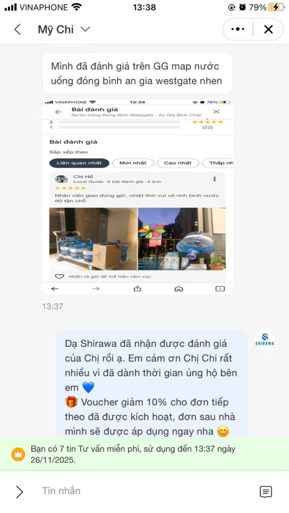 Sau khi bạn gửi ảnh chụp màn hình đánh giá qua Zalo, nhân viên Shirawa sẽ kiểm tra trong vòng 1-2 giờ (giờ hành chính) và gửi ngay mã voucher cho bạn qua Zalo.