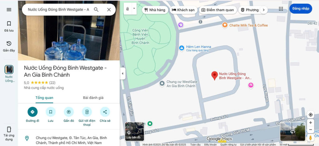 Mở ứng dụng Google Maps trên điện thoại hoặc truy cập maps.google.com trên máy tính. Tìm kiếm “Nước Uống Đóng Bình Westgate – An Gia Bình Chánh“